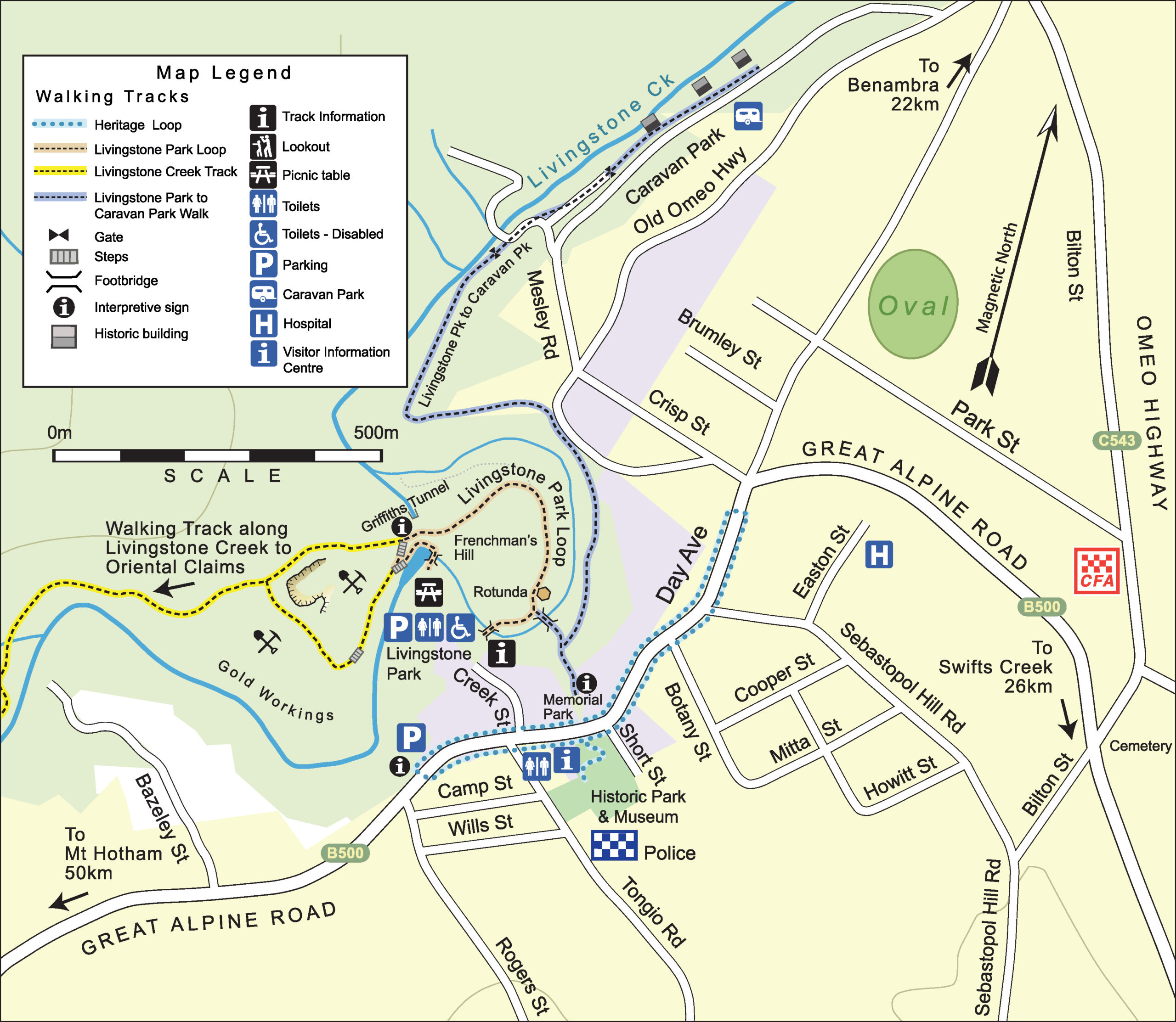A short, easy walk which follows the course of the Livingstone Creek to the Omeo Caravan Park. Walkers are rewarded with lovely views of the town and the picturesque creek. Mature Poplar trees, planted in the grounds of the caravan park more than 50 years ago, offer shady camping and picnic places in summer as well as lovely autumn colour.