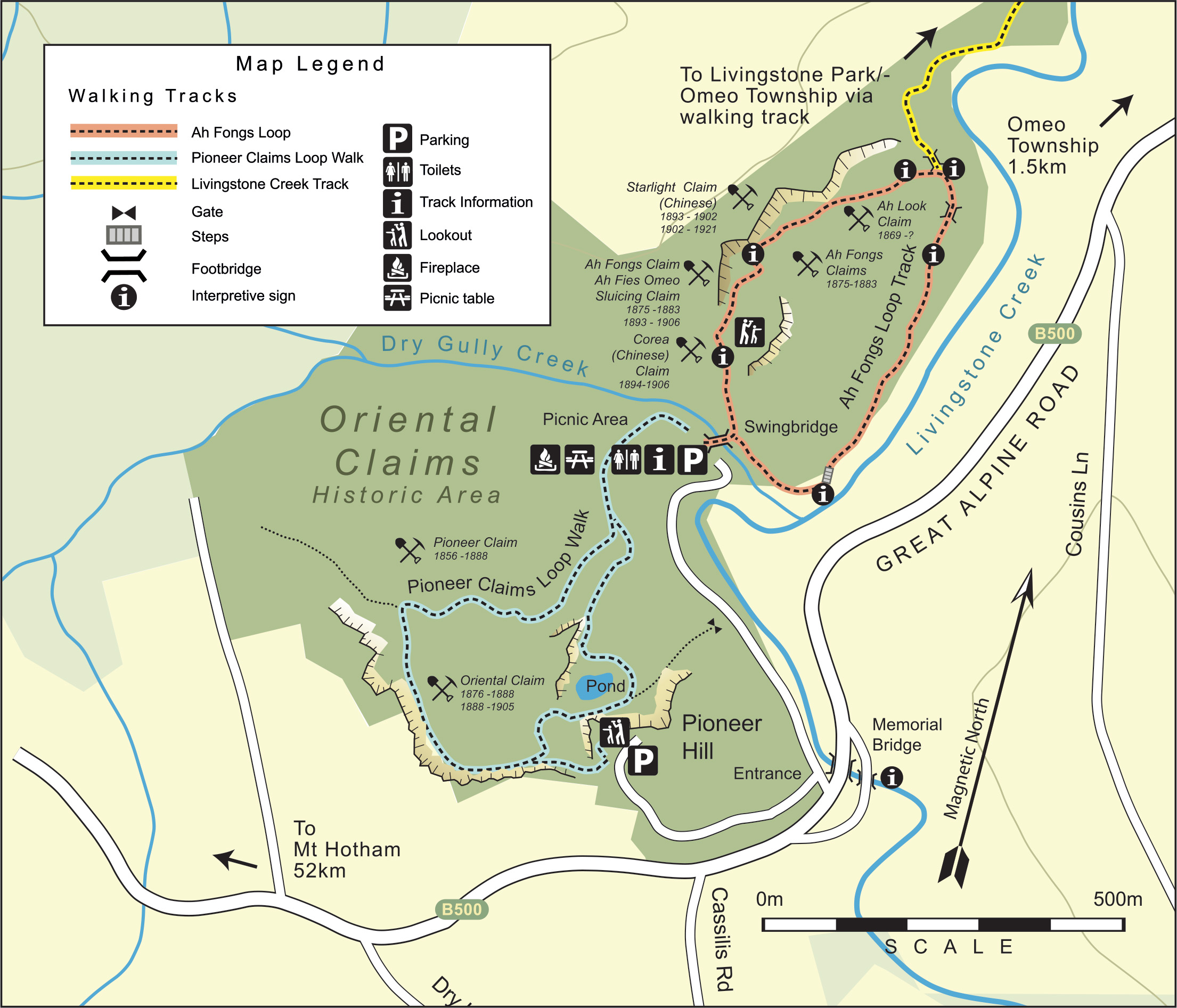 There are two excellent walks around the Oriental Claims – Ah Fongs Loop and the Pioneer Claims Walk – which offer interesting interpretive signage, close-up views of mining operations and scenic vistas of Livingstone Creek and the countryside surrounding Omeo. The reserve is well equipped with picnic, BBQ and toilet facilities. Walk to the Oriental Claims Reserve via the Oriental Claims Walk from Livingstone Park – 1.8 km, or drive to the car park from the western end of town and start the walks from the picnic area.