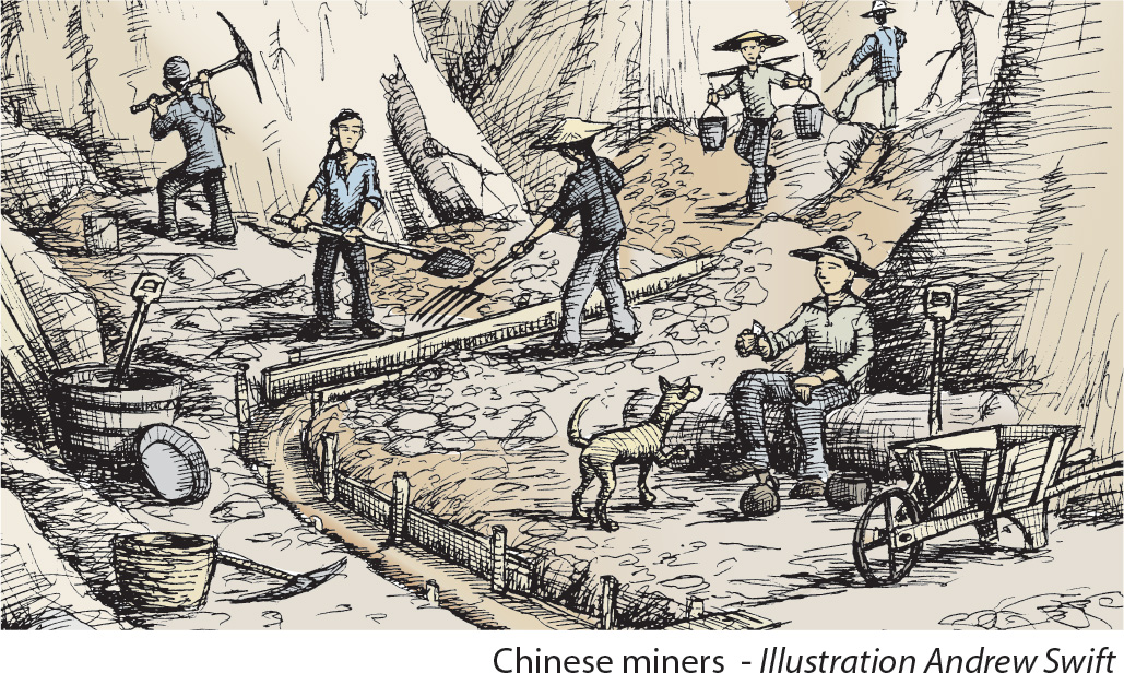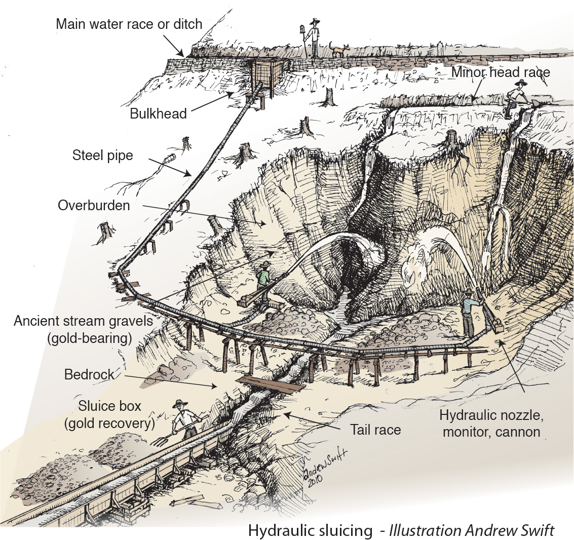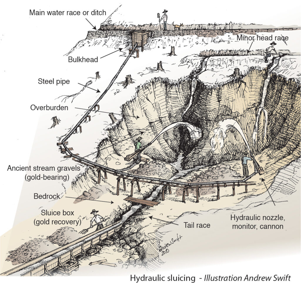 The exposed clay cliffs towering over the area were created by high pressure hydraulic ‘sluicing’ operations. This method of gold extraction, which washed vast quantities of soil and gravel into sluice boxes from which the gold was extracted, was